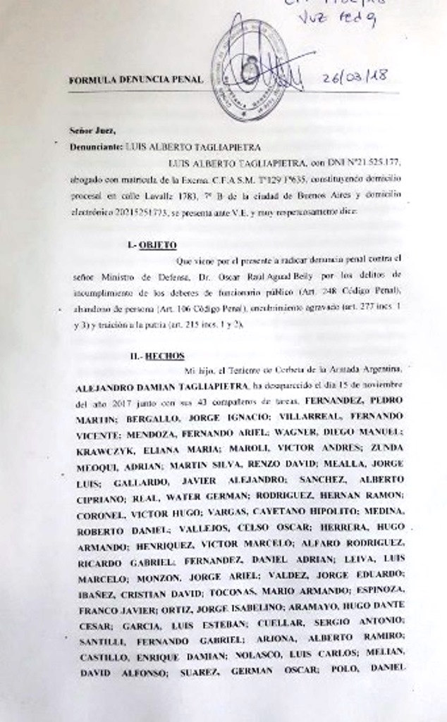 El abogado Luis Tagliapietra, padre de Alejandro, uno de los tripulantes del submarino, confirmó que un grupo de familiares presentó una denuncia penal contra el ministro de Defensa "por incumplimiento de los deberes de funcionarios público, encubrimiento, abandono de persona y traición a la patria”.