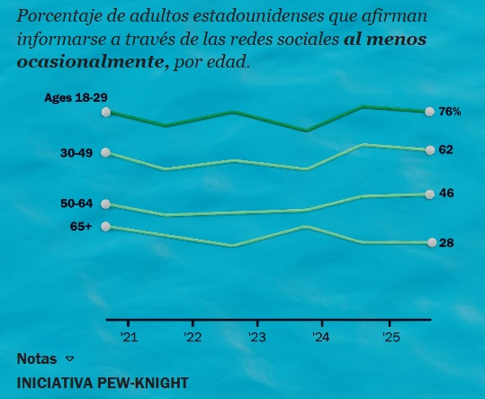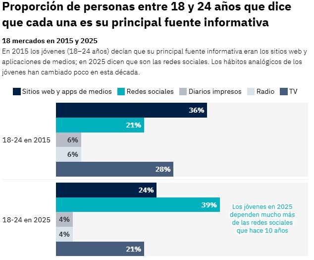 Esto se traduce en que los jóvenes también muestran menos interés en las noticias: según las encuestas de 2025, solo un tercio de ellos (35 %) se interesan “mucho” por las noticias, frente al 52 % de los mayores de 54 años.