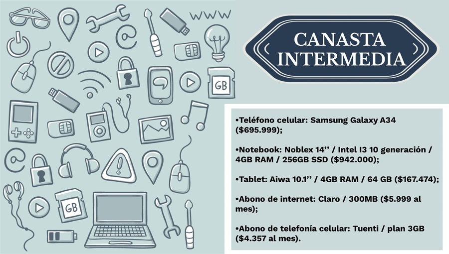 Canasta intermedia total: Los cálculos de los precios de estos equipos indican que para acceder al mundo tecnológico se deben desembolsar $1.769.473, mientras que los dos abonos tienen un precio final de $10.356 al mes.