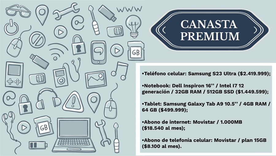 Canasta básica total: Los cálculos de los precios de estos equipos indican que para acceder al mundo tecnológico se deben desembolsar $599.451, mientras que los dos abonos tienen un precio final de $3.949 al mes.
