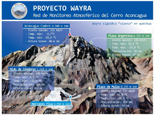 Aconcagua se une así a las cimas más altas del mundo donde se han desarrollado este tipo de observatorios meteorológicos: Quelccaya (5.650 m snm) y Ausangate (6.349 m snm) en los Andes Tropicales de Perú, Cerro Tupungato (6.505 m snm) en los Andes Centrales de Chile y Argentina, y Everest (8.480 m snm) en el Himalaya.