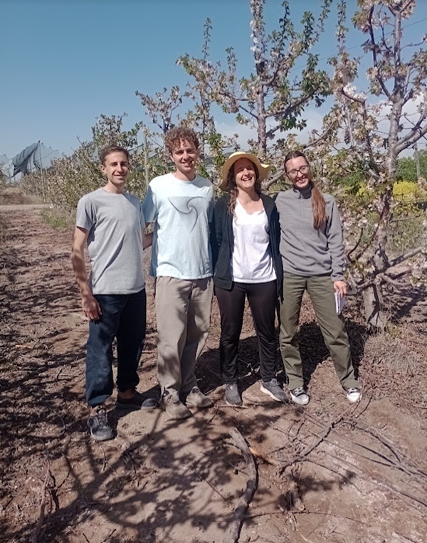 Parcela de fruticultura de la FCA UNCUYO. De izquierda a derecha: Felipe Domínguez, Juan Francisco Córica, Regina Aguilera, Ana Laura Selán. Foto: gentileza Regina Aguilera