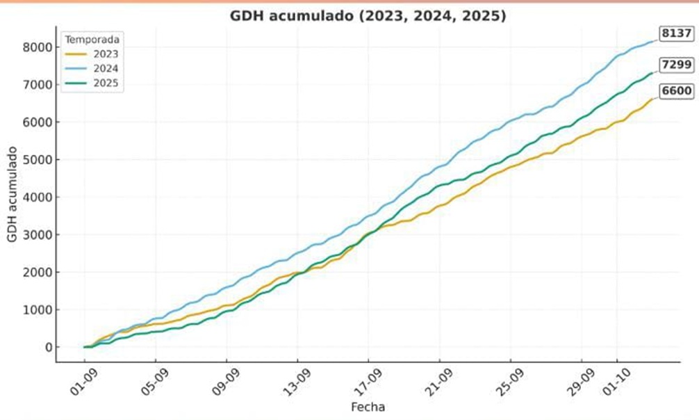 “Comparado con un histórico, sí, estamos con una acumulación mayor de calor respecto de hace varios años. El año pasado fue récord, pero, aun así, este 2025 presenta valores elevados. Desde septiembre hasta esta fecha (4 de octubre de 2025), registramos 7113 grados-horas de calor acumulados contra 8029 total del año pasado. Eso indica que estamos por debajo de 2024, aunque podemos estar todavía por encima”, explicó la ingeniera agrónoma Regina Aguilera, docente adjunta de la cátedra de Meteorología Agrícola de la Facultad de Ciencias Agrarias de la UNCUYO.