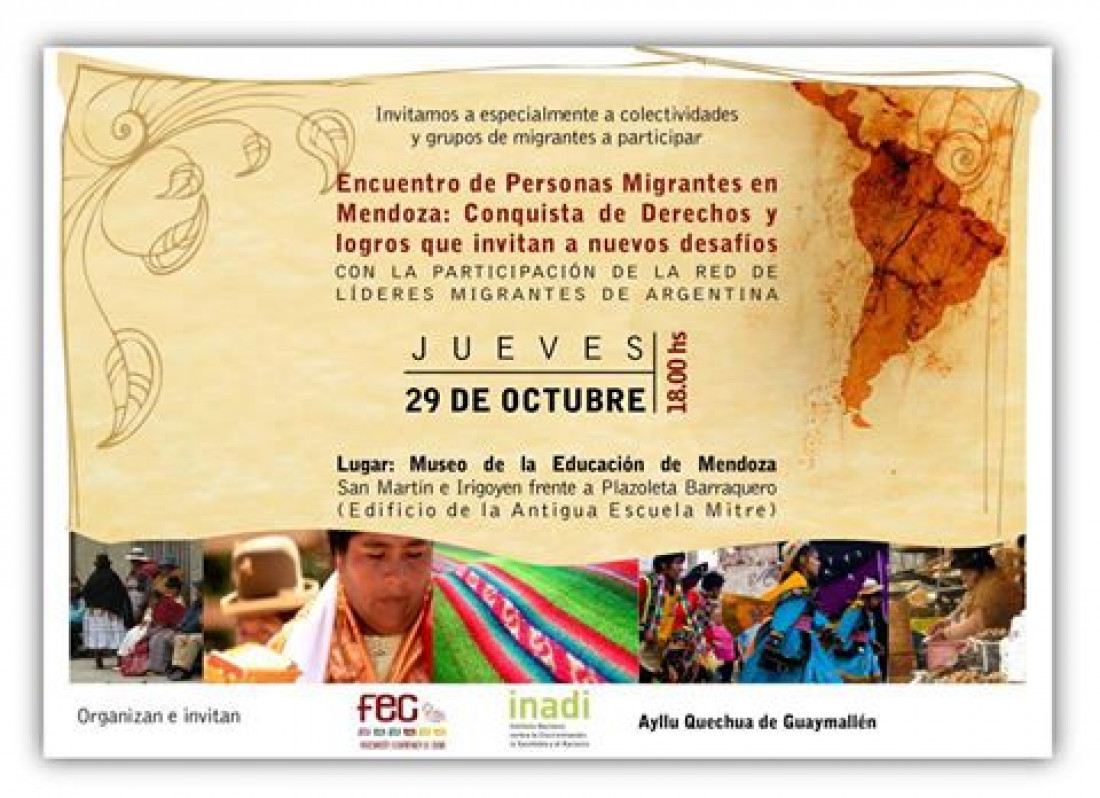Desde el Ayllu Quechua de Guaymallén, Inadi y la Fundación Ecuménica de Cuyo convocan a los migrantes y colectividades a participar de este Encuentro, donde evaluarán nuevos desafíos y los derechos conquistados.