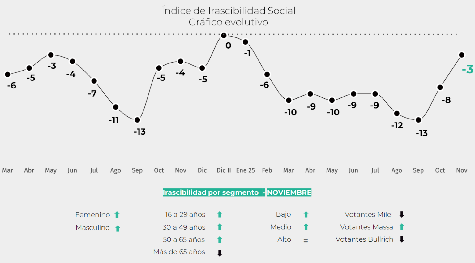 En la última medición difundida del IDI, realizada a fines de noviembre, se pasó de -8 (valor de octubre) a -3, lo que evidencia una mejora en el humor de las y los argentinos y una reducción de la irascibilidad social.