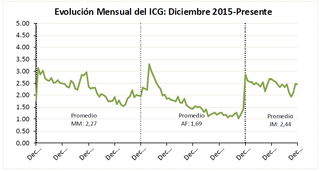 El ICG de diciembre fue de 2,46 puntos. Este nivel, indicó el informe, representa una leve disminución de 0,1 % respecto del mes anterior, pero sostenido tras la baja más pronuncida del año, que fue septiembre.
