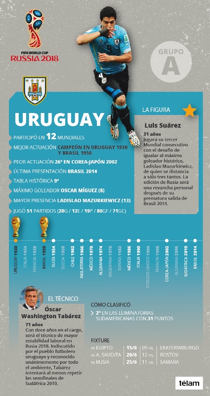 El jugador más desequilibrante, entre otros, es Luis Suárez. El delantero es estrella del Barcelona y con su seleccionado ha disputado 97 partidos con un saldo de 50 goles. Es el máximo goleador histórico de Uruguay.
