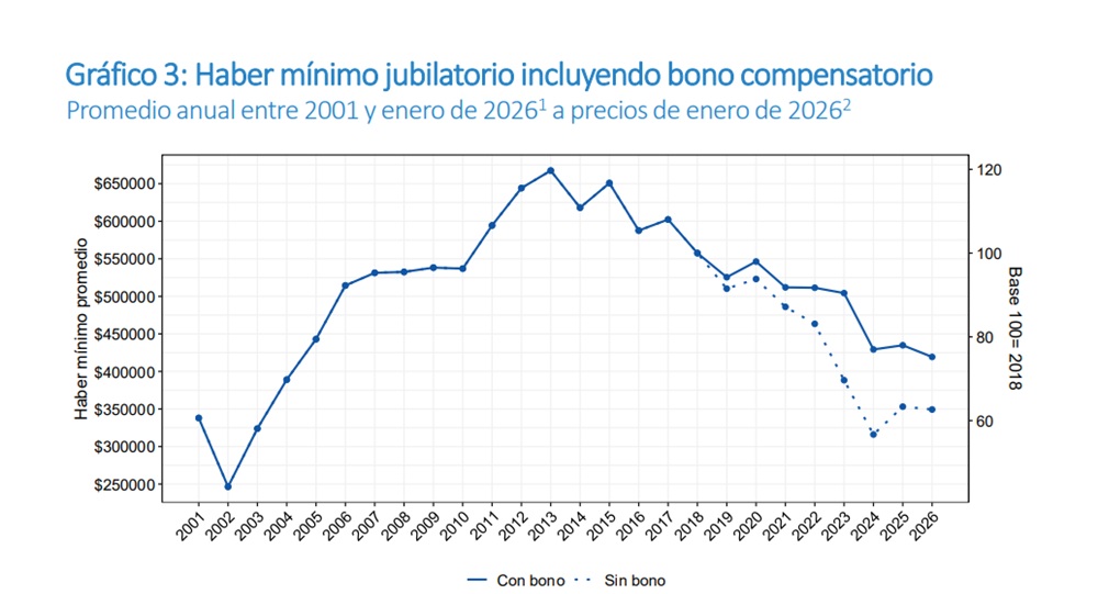 Según el informe, en la primera década del siglo XXI, luego de la caída experimentada entre 2001-2002, en un contexto de recuperación y crecimiento económico, con relativamente baja tasa de inflación, el monto real del haber mínimo jubilatorio fue en aumento, pasando de $246.453 promedio en el año 2002 a $667.458 en el año 2013 (a precios de enero de 2026), es decir, un crecimiento porcentual de alrededor del 170 %. A partir de ese año, el monto real promedio de estos haberes cayó entre 2013 y 2023 algo más del 40 % sin considerar los bonos no remunerativos (de $667.458 a $388.291), y del 25 % si se tienen en cuenta ($504.264). En cuanto a los bonos, en el informe se detalla que comenzaron a otorgarse discrecionalmente hacia fines de 2019 y que desde mediados de 2022 se mantienen en forma mensual, lo que atenuó la caída del haber mínimo durante el período de alta inflación de 2022-2024.