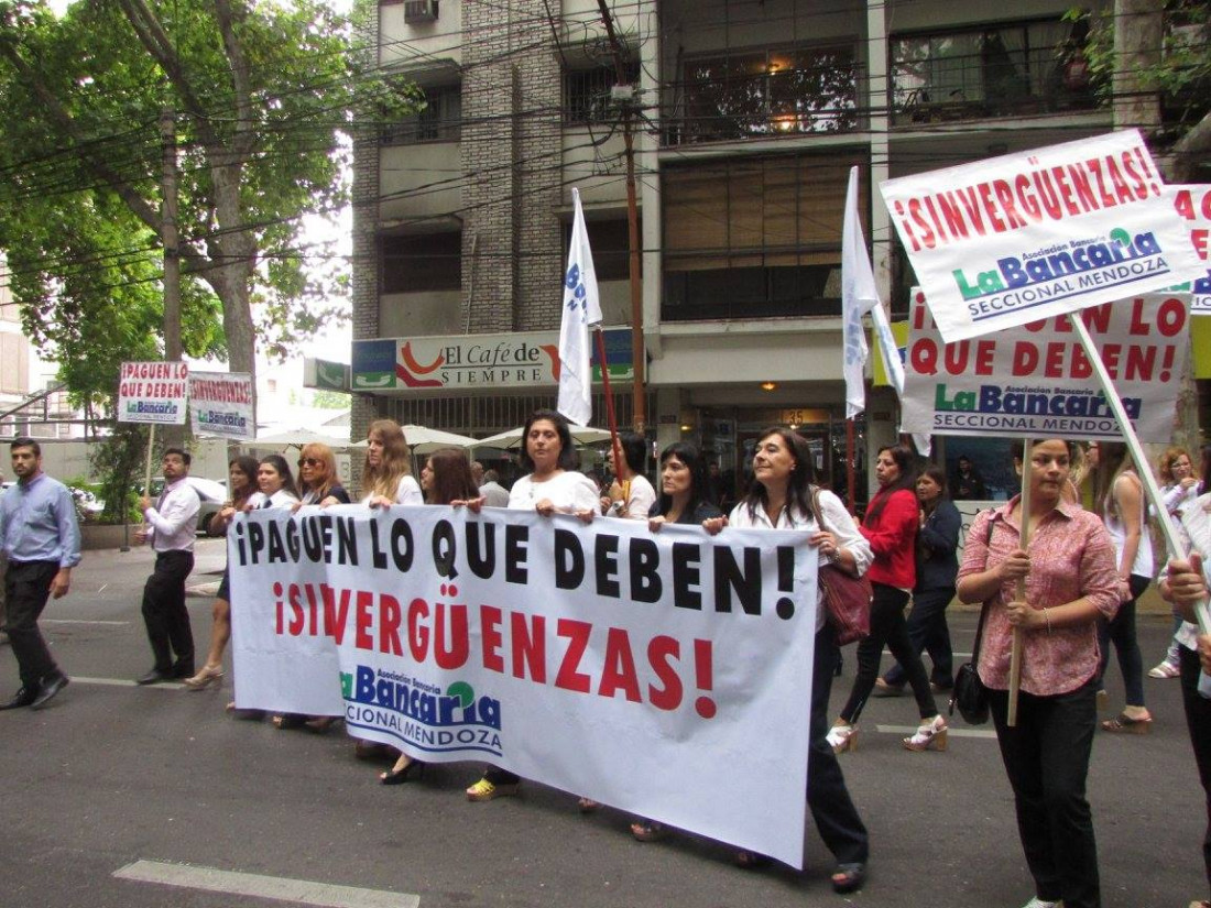 En Mendoza, la Asociación Bancaria realizó una concurrida movilización en el microcentro capitalino para repudiar a las cámaras patronales y al Ejecutivo nacional, que se niegan a cumplir un acuerdo paritario celebrado en noviembre del año pasado.