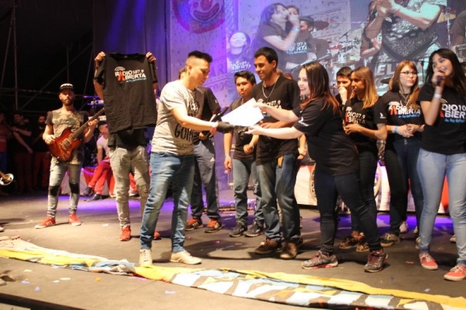El equipo de la radio de los estudiantes subió al escenario a entregarle una mención y regalos para la banda cordobesa.