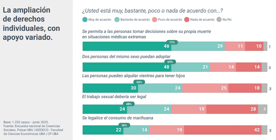 Finalmente, sostiene el informe, en el terreno de los derechos y libertades individuales, la sociedad argentina muestra un mapa heterogéneo. Predominan consensos progresistas estables (eutanasia, adopción homoparental e igualdad de género), junto a divisiones persistentes en torno al aborto, al trabajo sexual y a la subrogación de vientres. Aparece, además, un límite en la legalización de la marihuana.