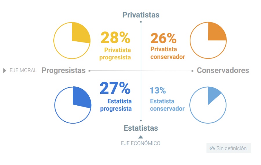 Estas categorías combinadas arrojaron cuatro perfiles ideológicos, distribuidos de la siguiente manera: el 28 % de los encuestados se ubica dentro del segmento Privatista Progresista, mientras que el 26 % lo hace como Privatista Conservador. En cambio, el 27 % se define como Estatista Progresista, y el 13 %, como Estatista Conservador. Esto confirma lo ya mencionado: el 54 % se ubica en posturas promercado, mientras que el 40 % lo hace como pro-Estado. En paralelo, el 55 % tiene posiciones progresistas, y el 39 %, más conservadoras. El 6 % de la muestra no pudo clasificarse.