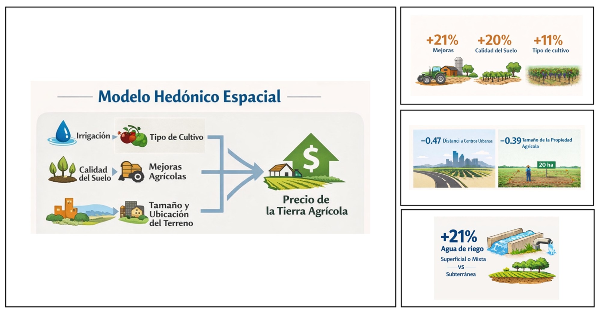 La metodología que se utilizó para el análisis fue la de precio hedónico espacial, una herramienta de la economía que permite estimar el valor de un bien —en este caso, la tierra agrícola— a partir de las características que lo componen. En total incluyeron 17 variables, entre ellas el tipo de agua de riego, la calidad del suelo, la distinta al kilómetro cero y el tamaño, entre otras.