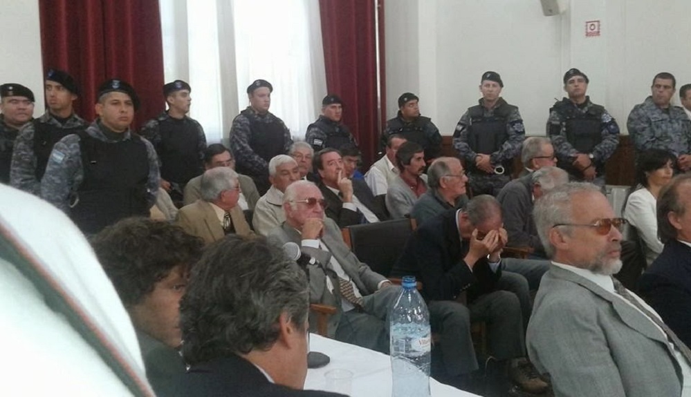 Los jueces en el banquillo de los acusados, junto con integrantes de las fuerzas armadas y de seguridad, custodiados por el Servicio Penitenciario. Foto: www.lesahumanidadmendoza.com