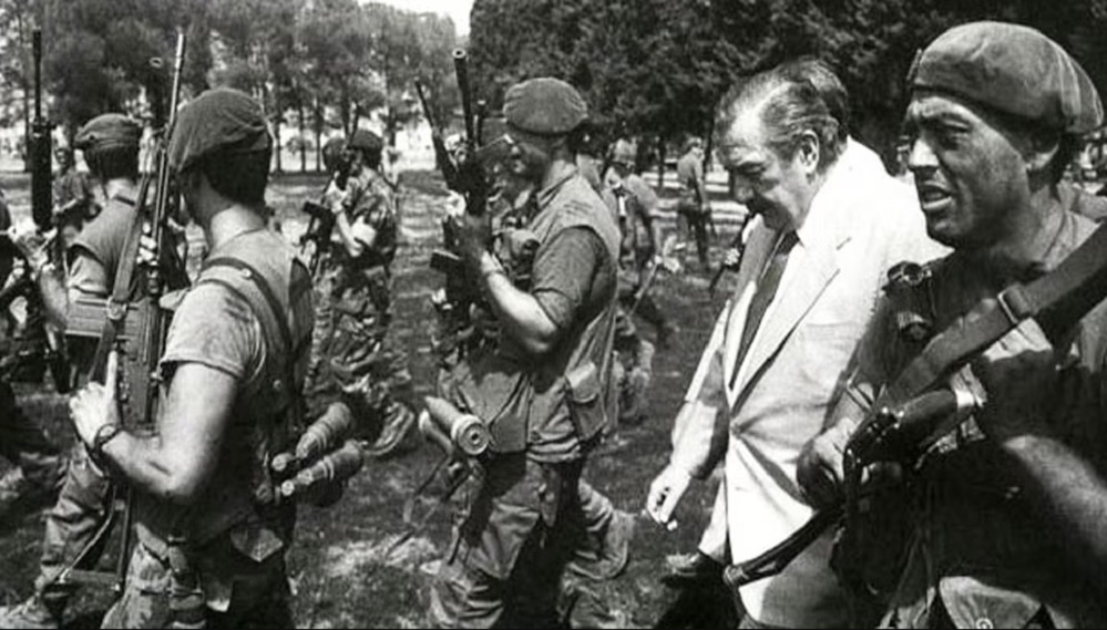 Alfonsín en el Regimiento de Infantería Mecanizada 3 de La Tablada, después de los combates y rodeado por comandos. Foto de Infobae.